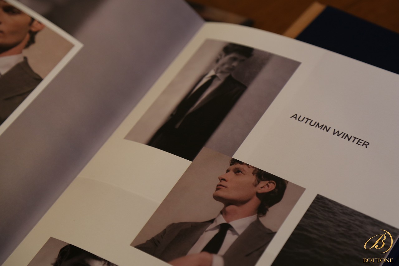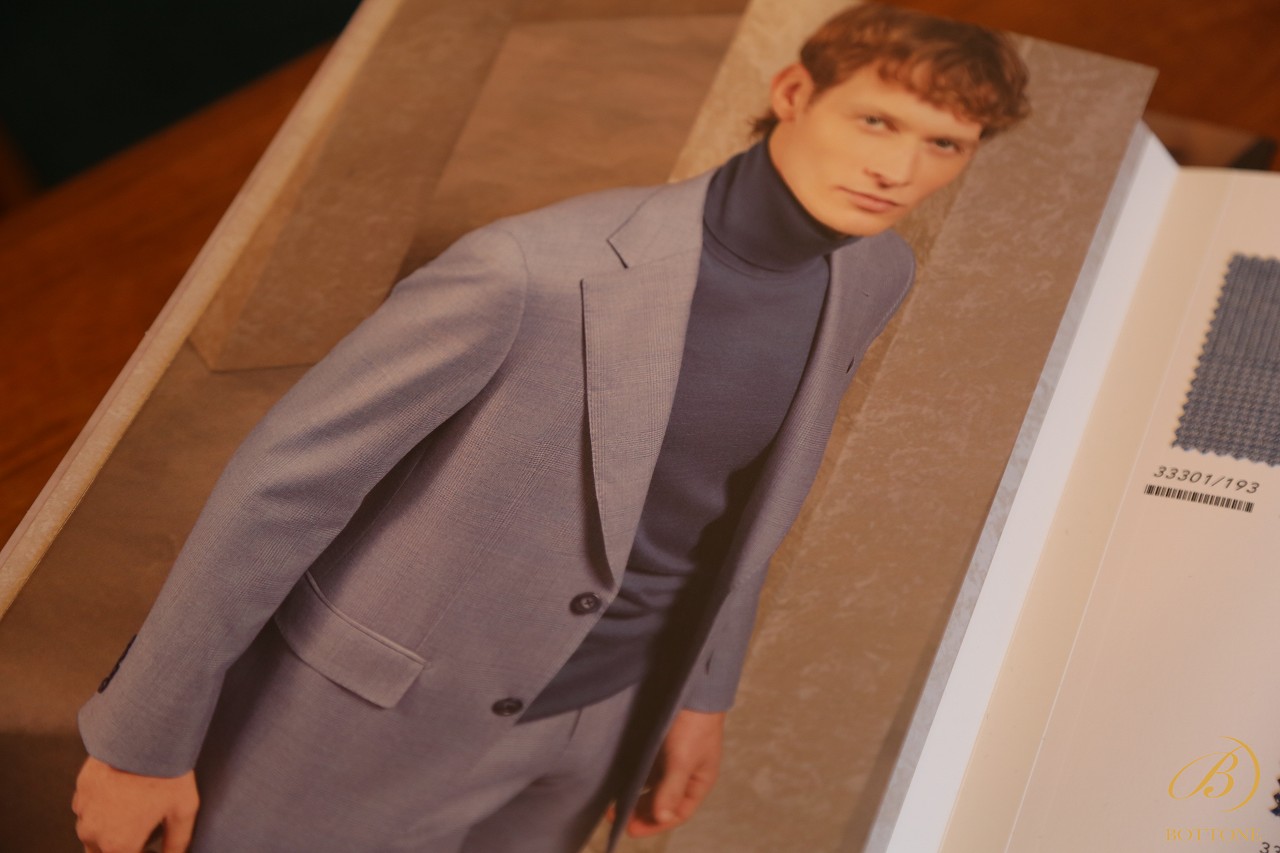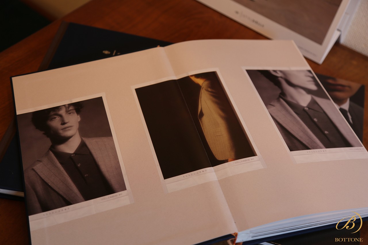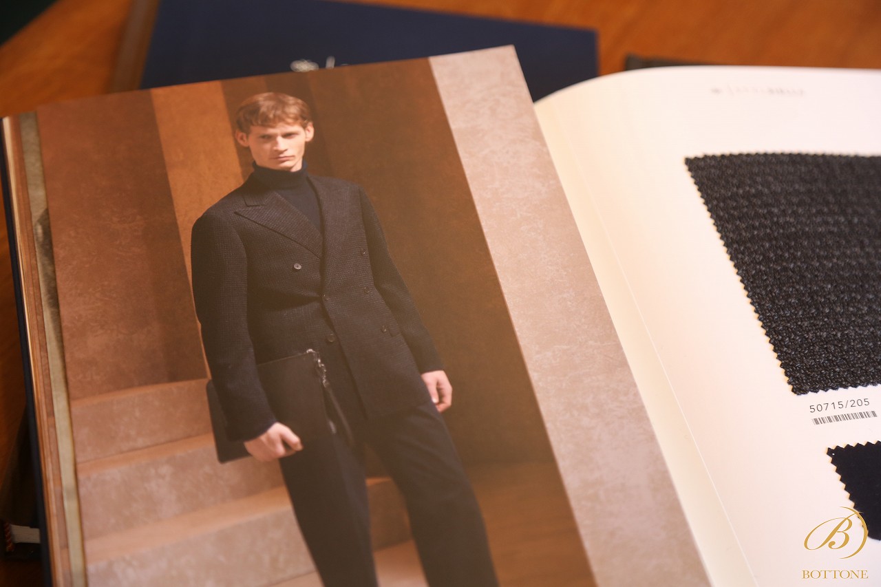 ご覧の通り、複数の冊子形式の生地ブックと、一般的なバンチブックと2つの構成から成っており、この冊子形式の方ではスーツ屋ジャケットの仕上がりイメージが確認できます。