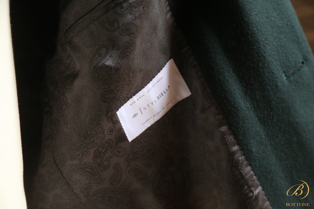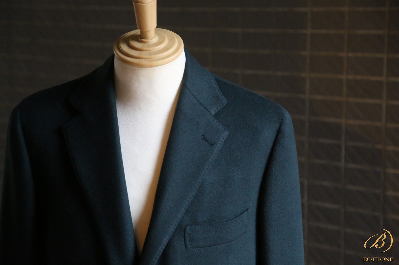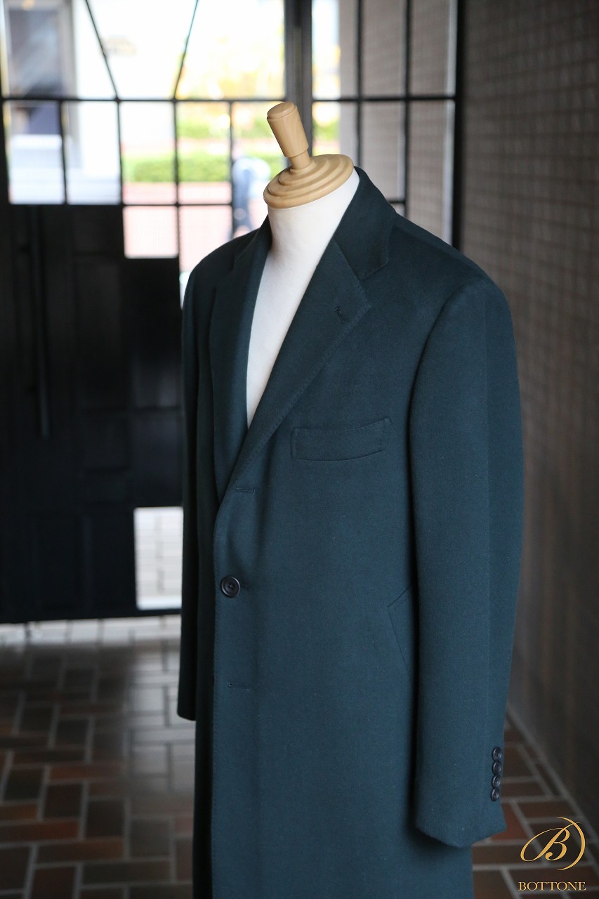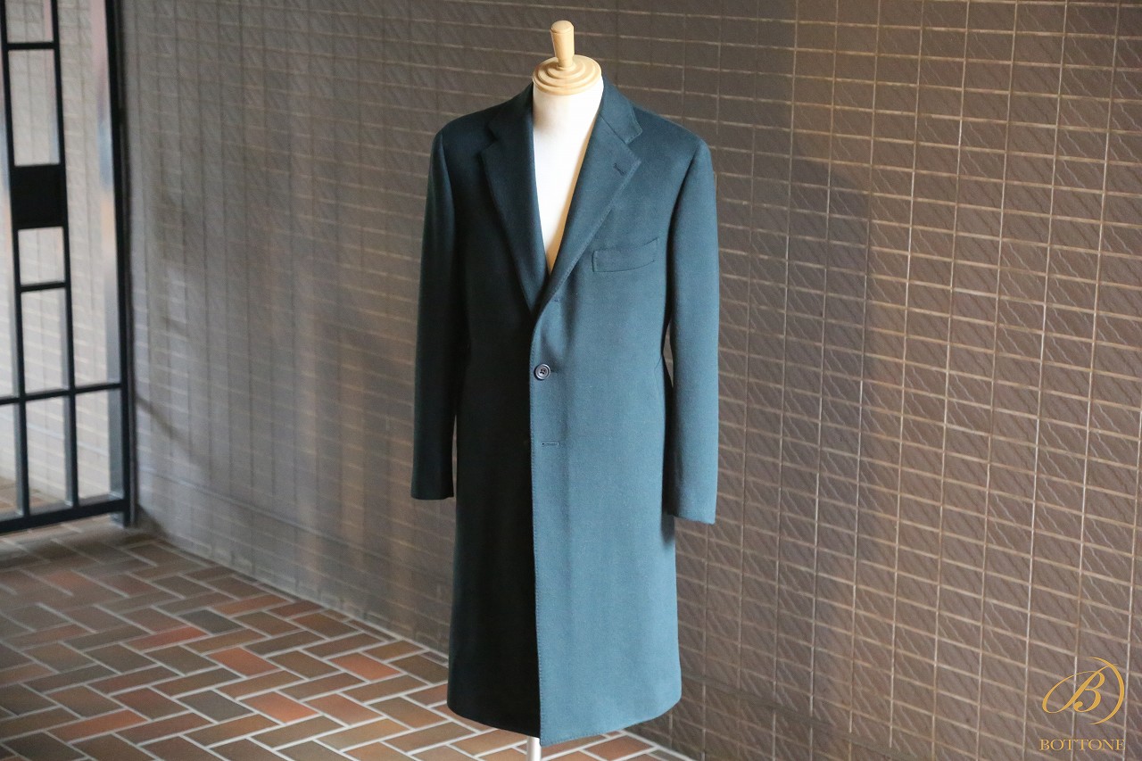今回ご紹介するのは、珍しいグリーンのウールカシミア生地でお仕立てしたチェスターフィールドコートです。オーダーくださったK様にとって、このグリーンは昨年から候補に挙がっていたカラー。しかし、なかなかイメージに合う生地に巡り合えず、お待ちいただいておりました。