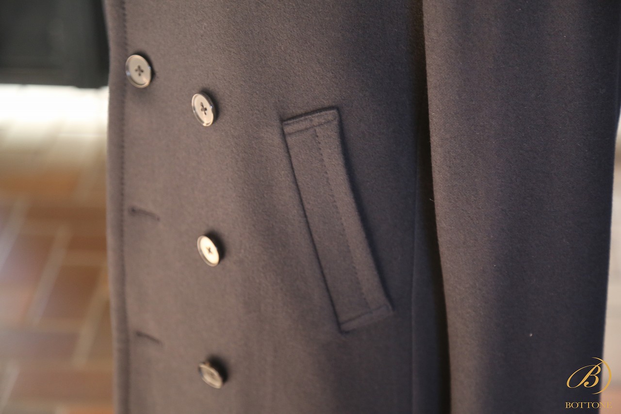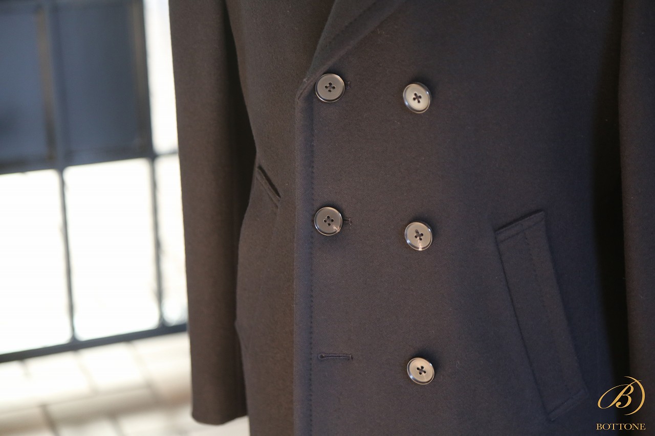 このような重厚感のあるコートには、やはりウールメルトンが最も相性が良いですね。ウールメルトンは目を詰めて織り上げた生地で、しっかりとした厚みと独特の風合いが特徴です。