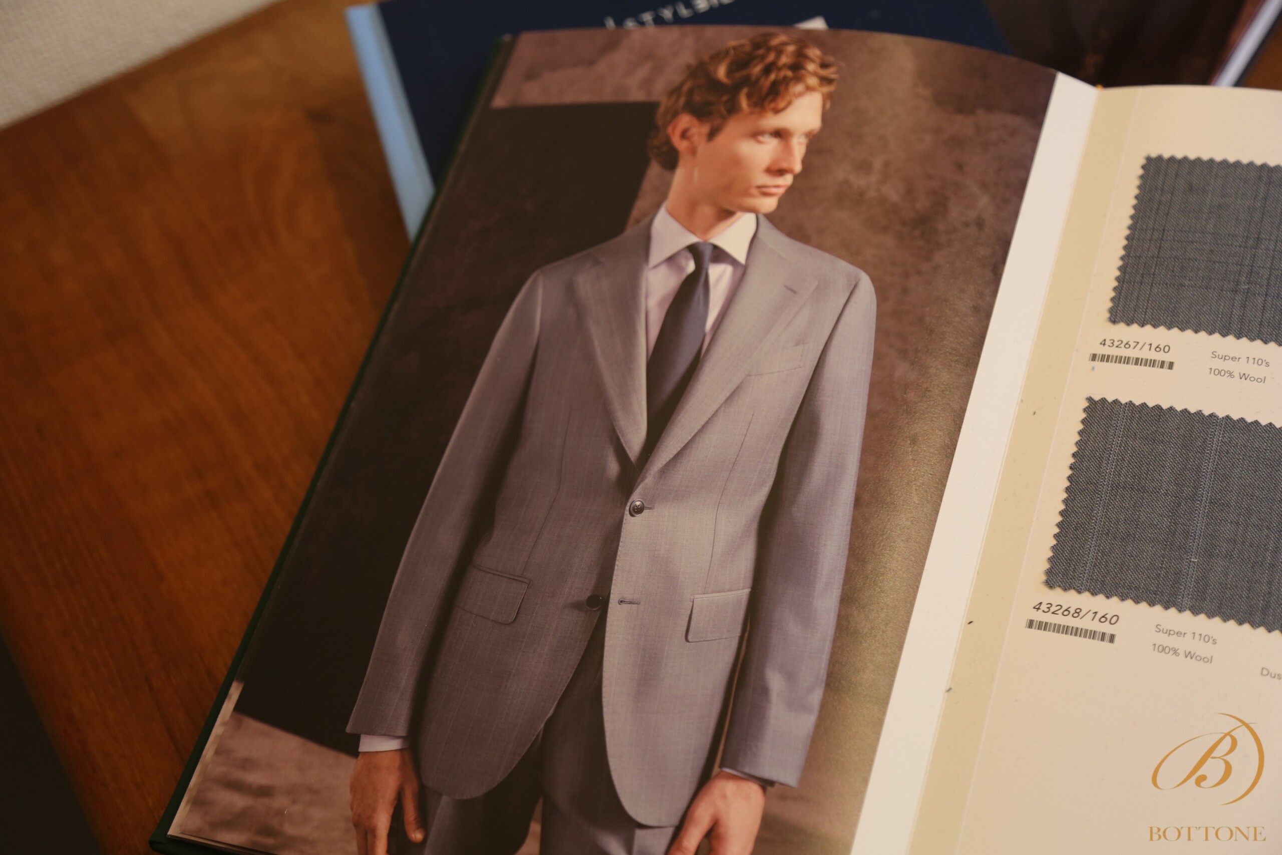 シンプルなネイビーやグレー無地のスーツであれば、オーダーに慣れている方でなくともある程度簡単に仕上がりのイメージができるのですが、普段あまり着ないような明るい色や柄(ストライプ、チェック)だと、スーツになった時にどんな姿になるかイメージしにくいですよね。