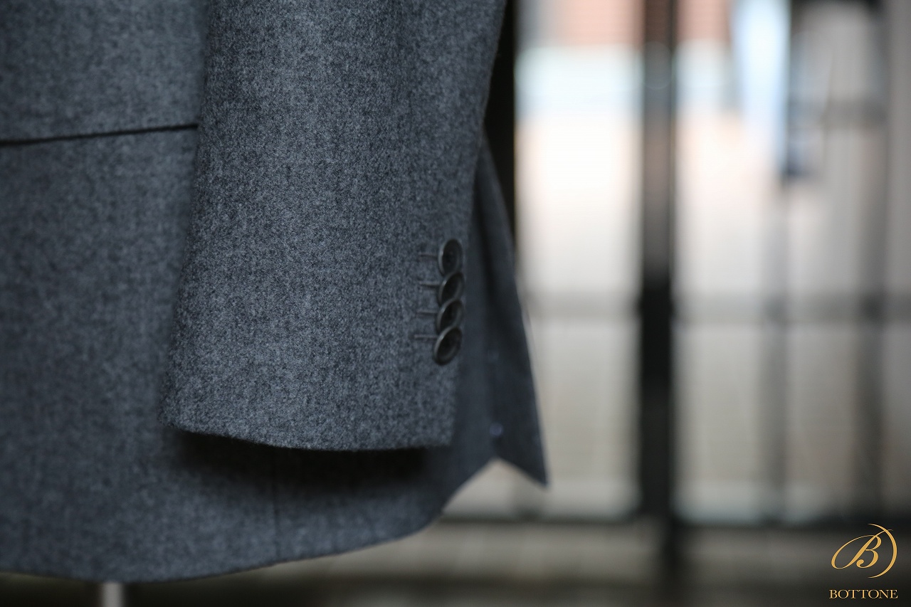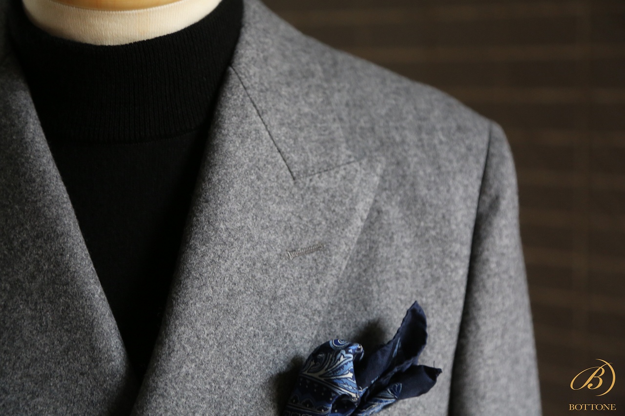 フランネル特有の起毛感が持つ柔らかな印象は、ダブルブレストの持つ力強さを程よく和らげ、親しみやすさも併せ持つバランスの良いスーツとなります。