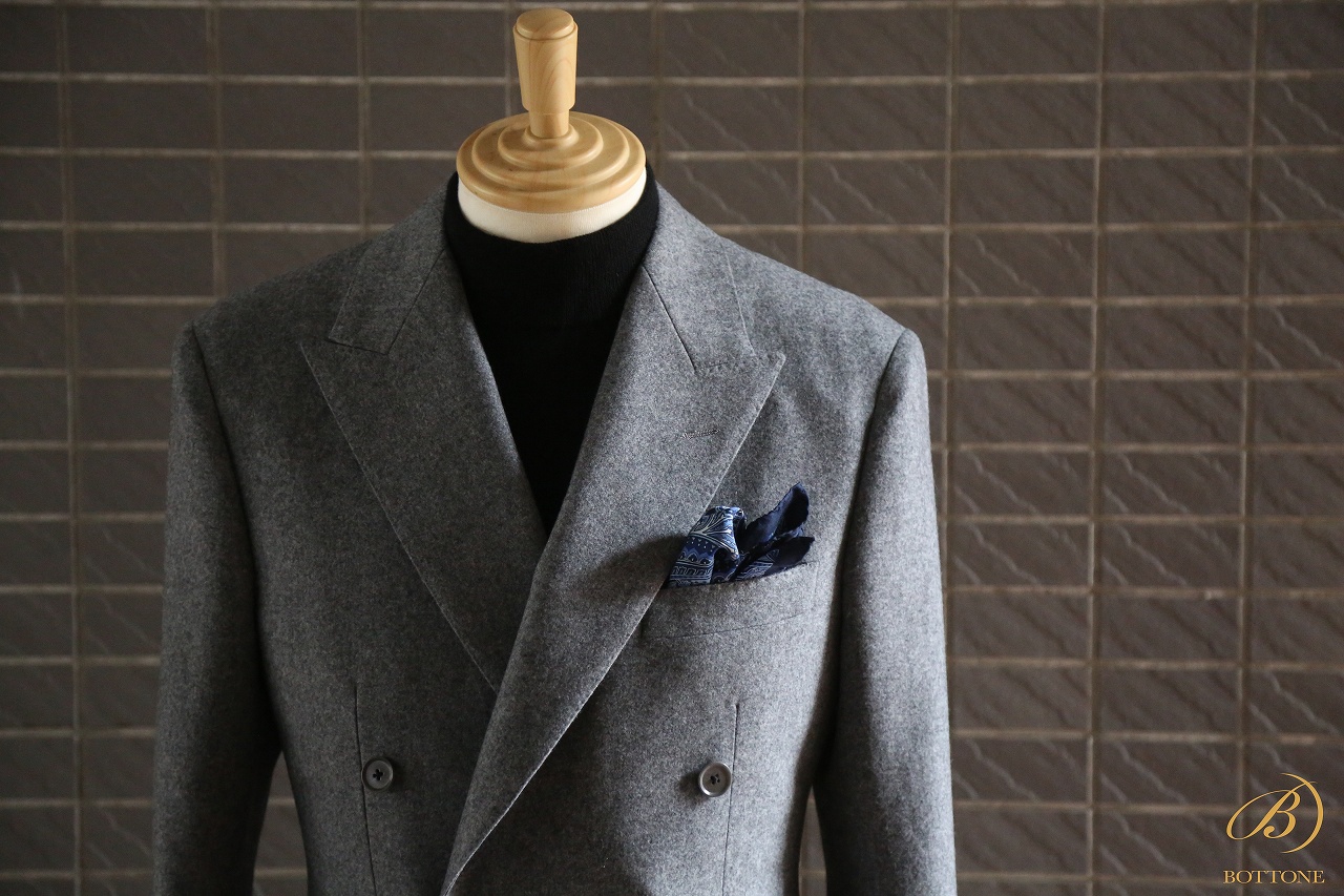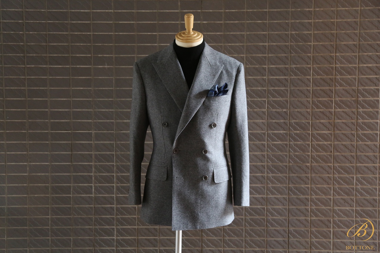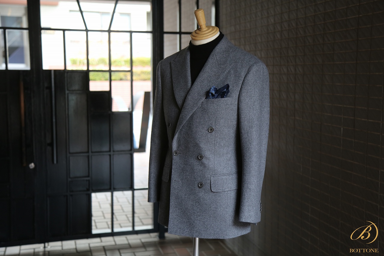 秋冬シーズンにぜひおすすめしたいのが、グレーのフランネル生地を使用したダブルブレストのスーツです。
