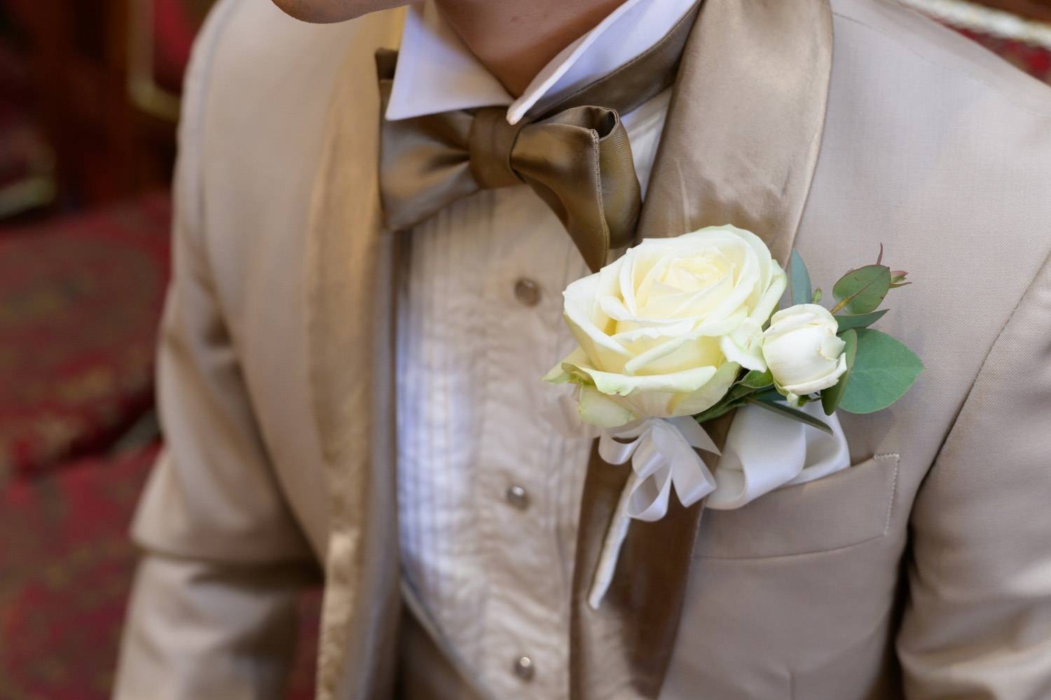 こちらも明るいトーンのベージュ生地でお仕立てしているのですが、襟や蝶ネクタイも含めてタキシード全体の生地を統一することで柔らかな印象を作り出すことができます。