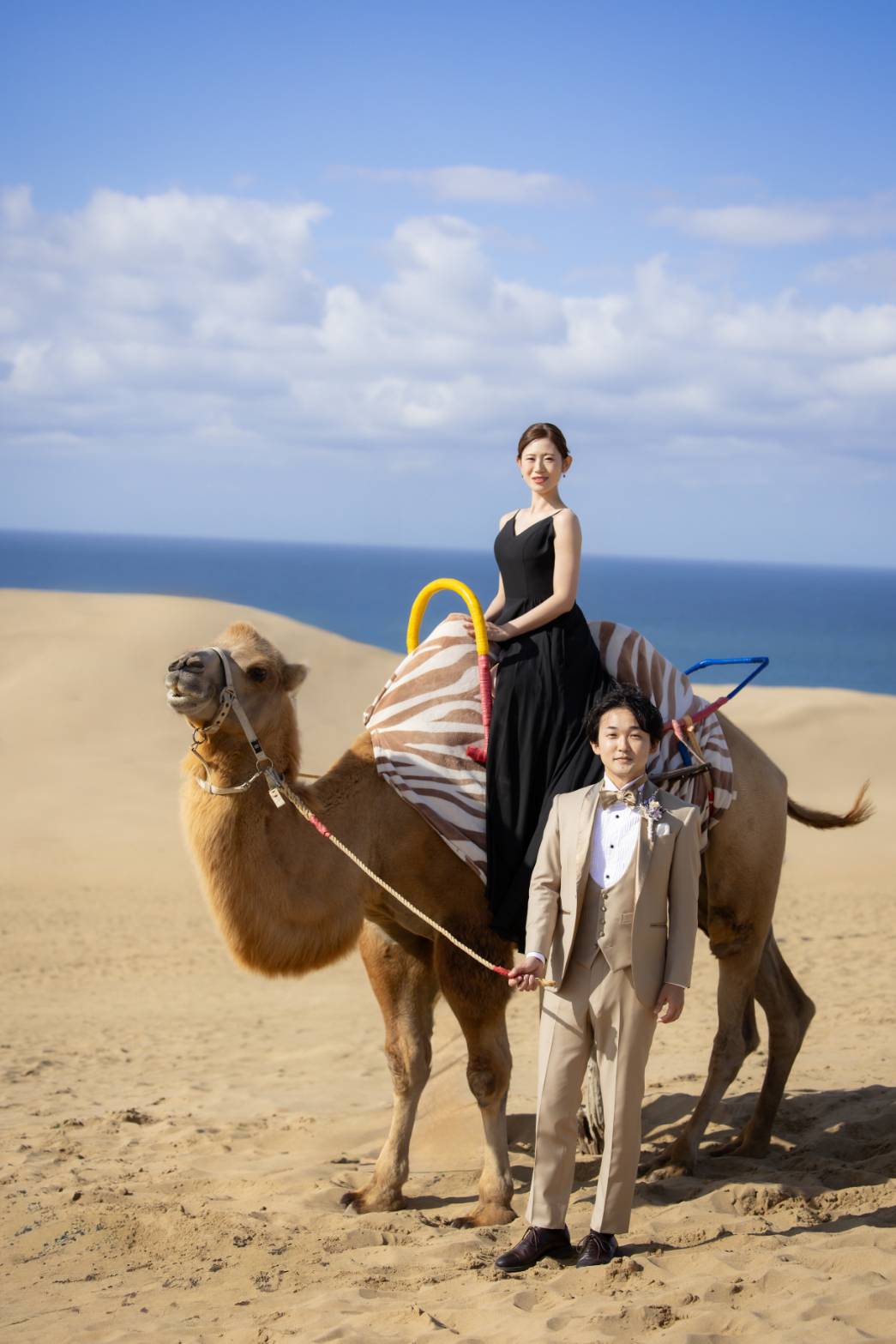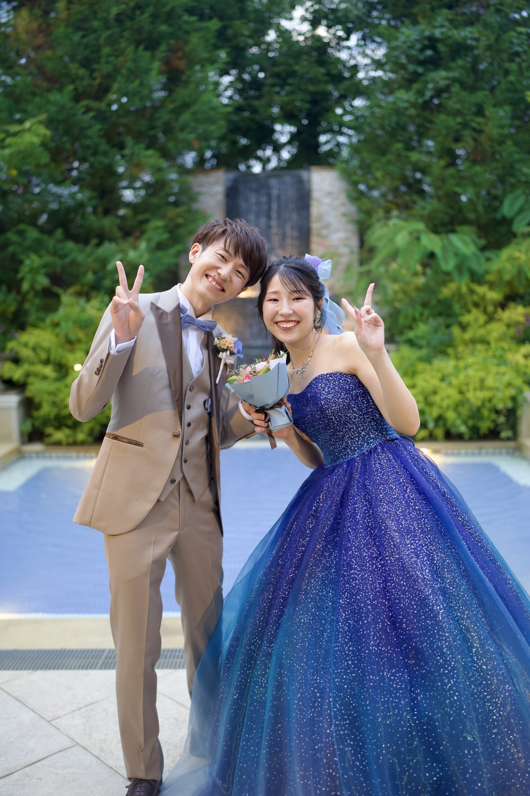 緑豊かなガーデンウエディングでも、青い海が広がるリゾートウエディングでも、ベージュタキシードは自然に溶け込み、写真映えする素敵な一着になります。